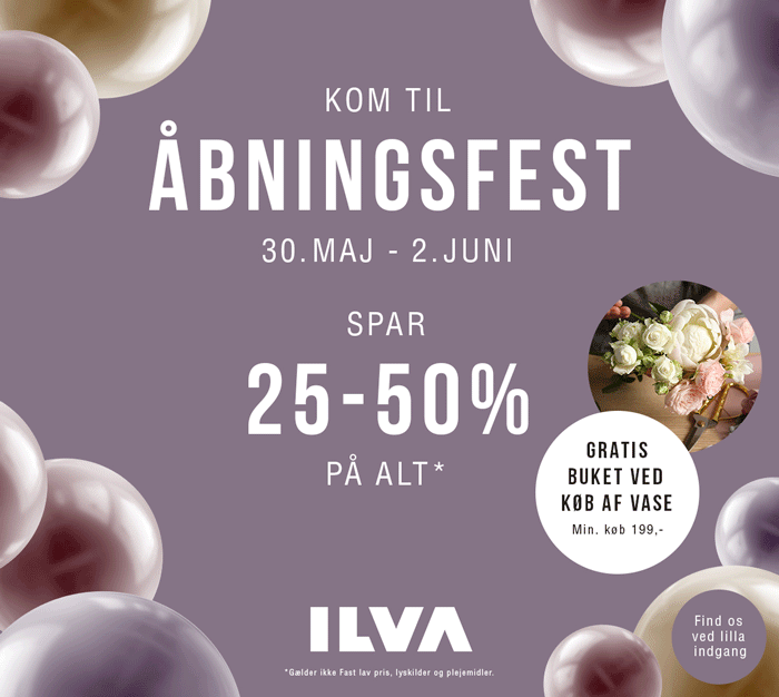 Bliv en del af den ultimative møbel- og interiørfejring! Ilva åbner dørene til en spektakulær åbningsfest i Kolding Storcenter den 30. maj. Dyk ned i vanvittige åbningstilbud på møbler, havemøbler og boliginteriør. Og vent, der er mere! Vær blandt de første til at shoppe og få en gratis bundet blomsterbuket med dit køb af vase. Plus, vind en sofa eller et havemøbelsæt og meget mere! Det er en åbning, du ikke vil gå glip af!